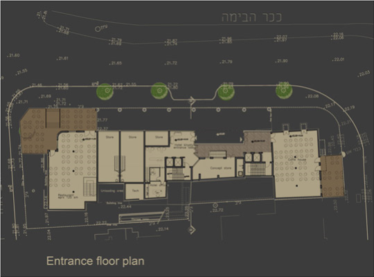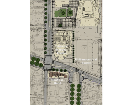 The northern glass façade is facing with the same style and design of the newly Habima theater and the philharmonic hall.