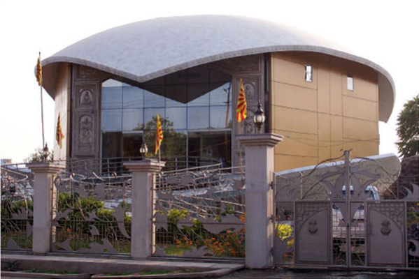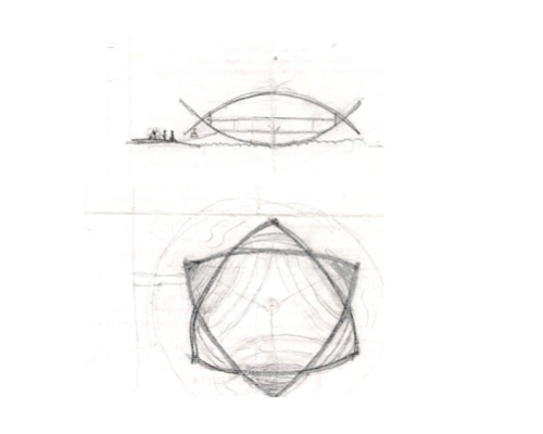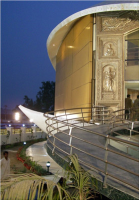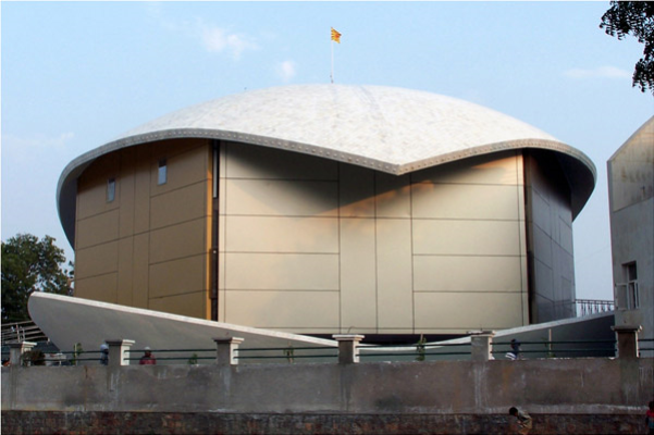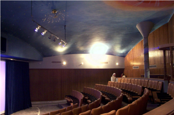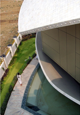 “pearl” is surrounded by external walls in different metal surfaces, that