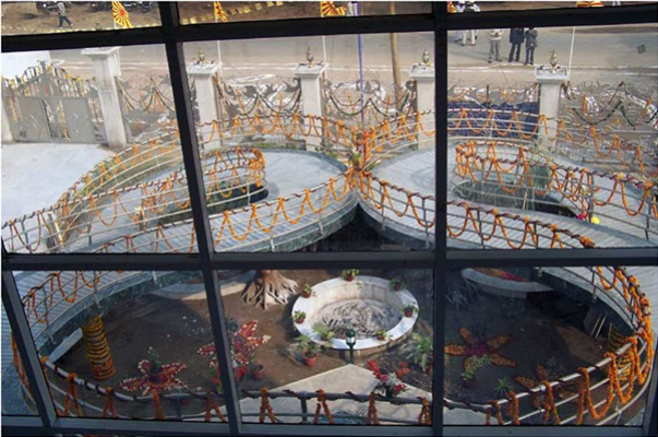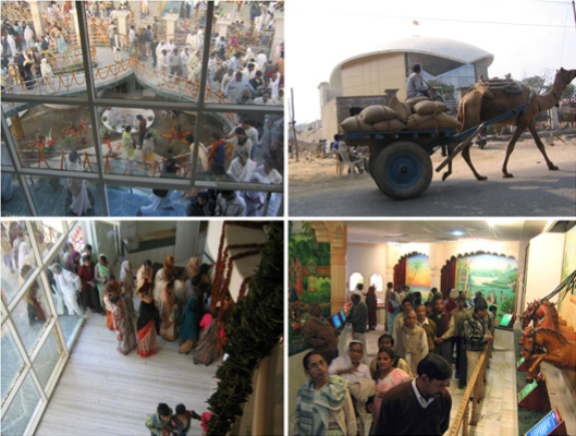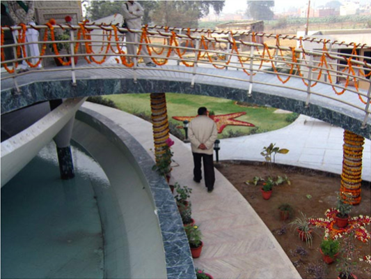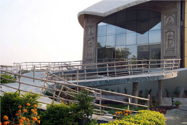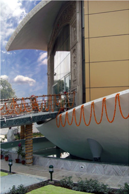 enter the building by crossing a bridge over the water, leaving the hectic and